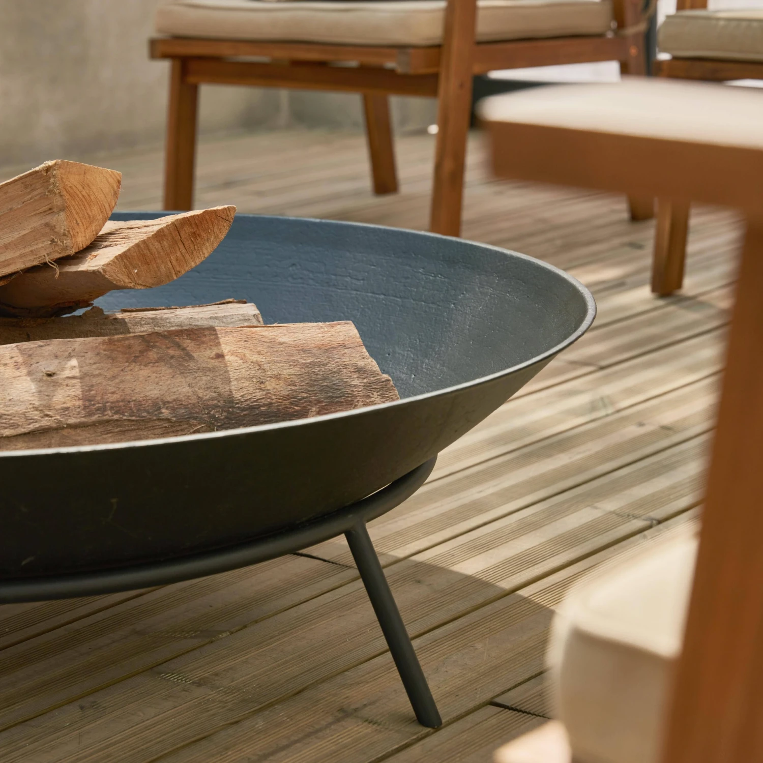 Avec sa forme de bol très large (Ø90cm), il peut contenir un grand volume de bûche. Fabriqué en fonte noire, il a une bonne résistance à la chaleur et est conçu pour durer.