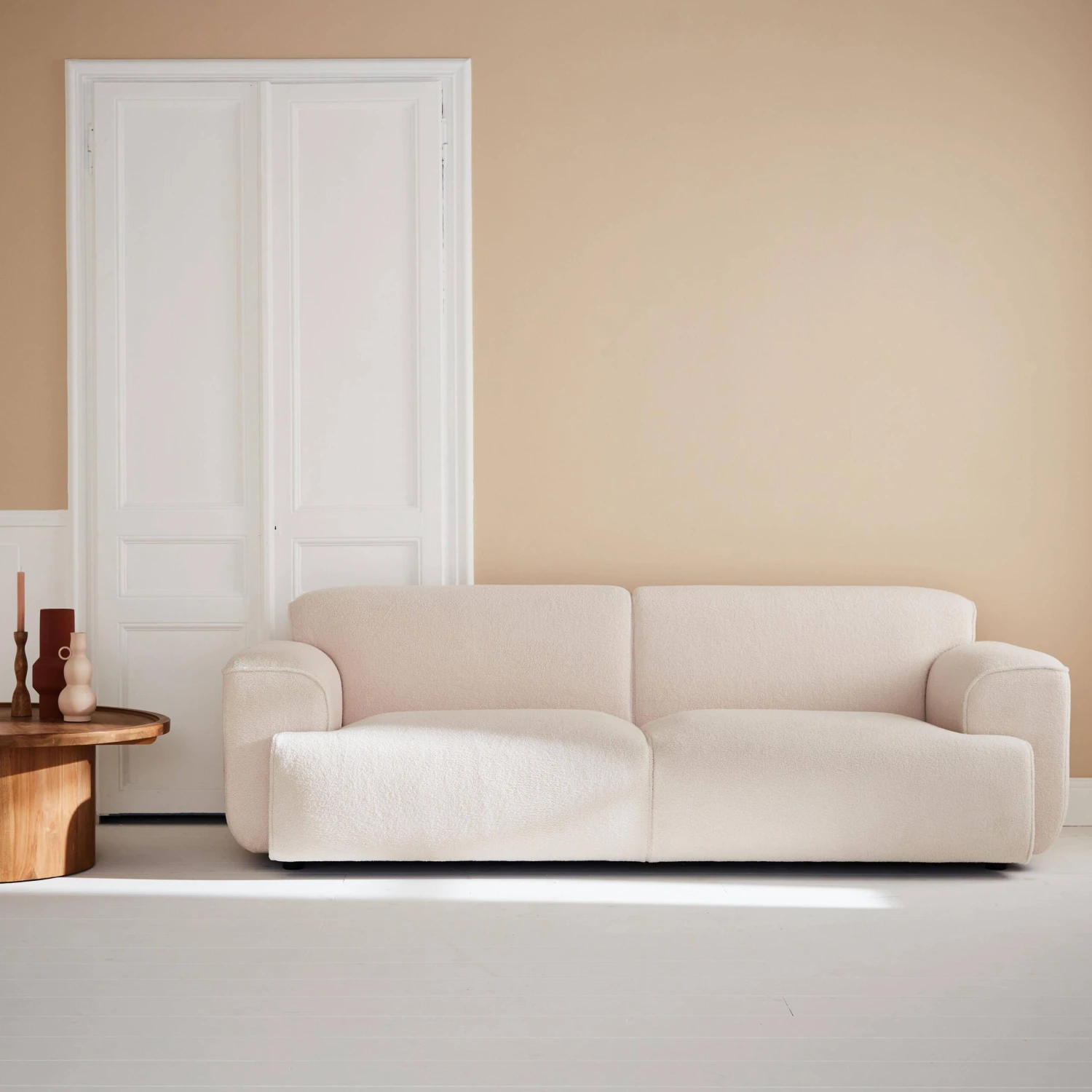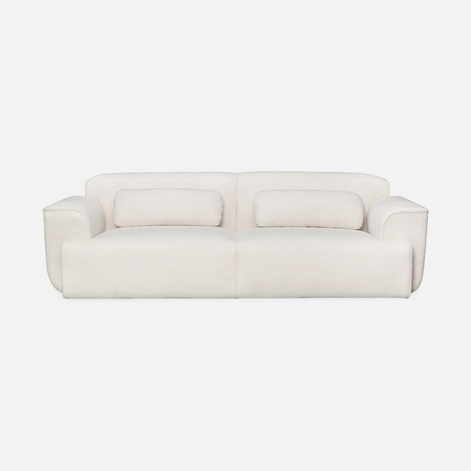 Ce canapé ne manquera pas de rehausser une décoration trop classique grâce à son revêtement en bouclette blanche. Son design profondément chic et élégant reste simple mais original. Grâce à son assise profonde pouvant accueillir jusqu’à 3 personnes, ce canapé vous accompagnera dans vos moments de détente le week-end ou après une longue journée de travail. Fourni avec 2 petits coussins rectangulaires déhoussables, vous pourrez sans problème les accompagner d’un plaid bien chaud pour encore plus de style. Pour couronner le tout, vous n’aurez pas à vous embêter quant à son montage, seuls les pieds sont à monter. Offrez-vous un salon minimaliste et réconfortant grâce à son tissu bouclette tout doux et à ses lignes raffinées !