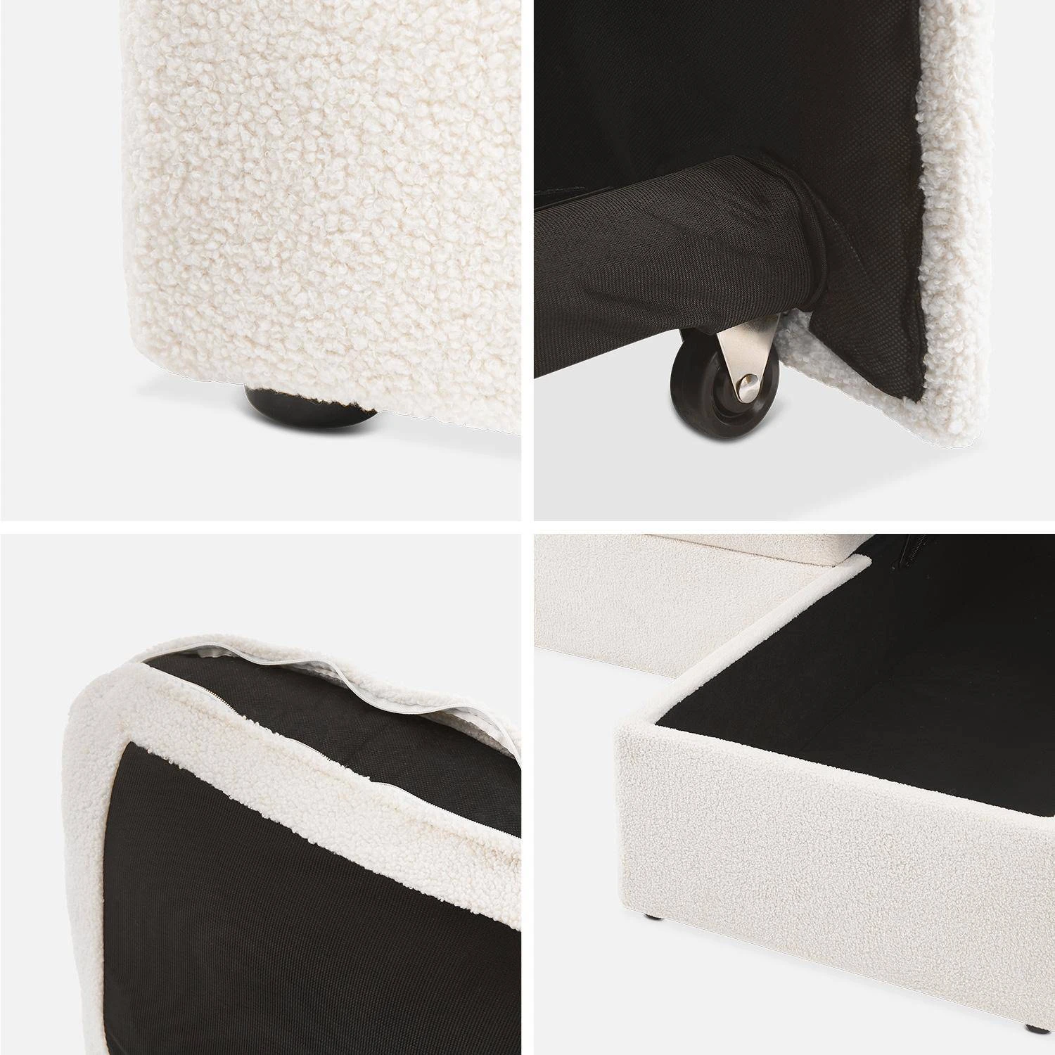 Autorisez-vous une pause confort sur notre canapé URBAN et ses deux petits coussins inclus. Contemporain et élégant, il a l’avantage de s’accorder avec tous les styles de décoration. Grâce à son assise ferme et ses deux méridiennes, ce canapé est très confortable. Son revêtement cooconing en bouclette blanche quant à lui, crée une ambiance chaleureuse à la maison. Des proches arrivent à l’improviste ? Pas de soucis, ce canapé se transforme en lit deux personnes, il suffit d’enlever les coussins, de relever le tiroir-lit est le tour est joué ! Pour ranger draps et couvertures et garder un salon toujours bien rangé, les méridiennes cachent chacune un coffre de rangement. Voilà un canapé qui se révèlera vite être indispensable !