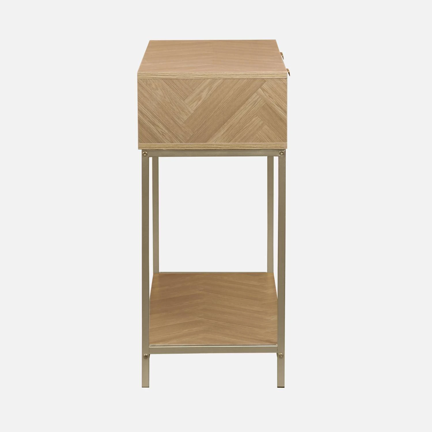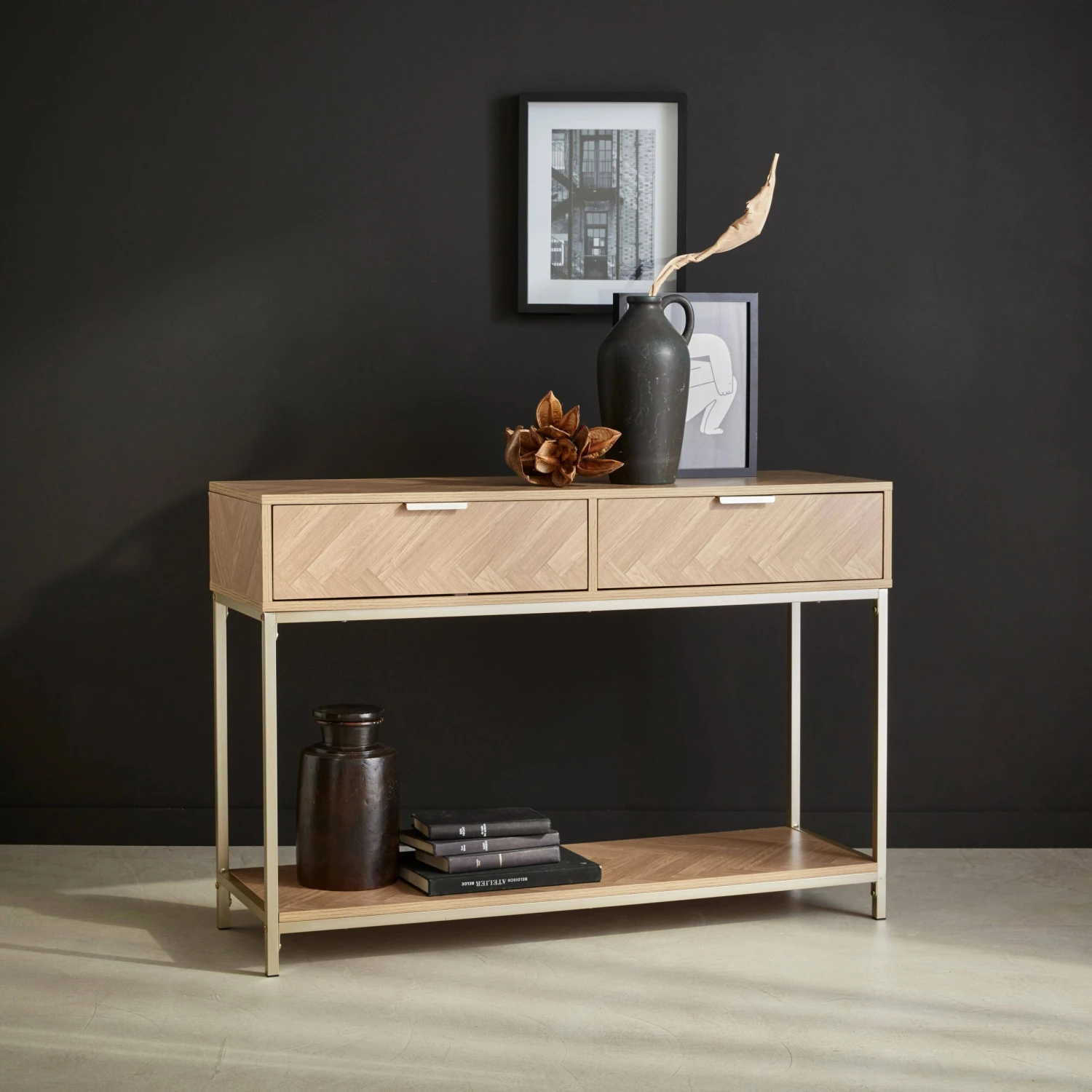 Dans un salon, un couloir ou même une chambre cette console s’inspirant du parquet point de Hongrie apportera beaucoup d’élégance à votre pièce. Ses poignées couleur champagne rectangulaires lui rajoutent un réel charme et font de ce meuble, une console intemporelle. Son décor chevrons qui l’habille permettra à votre intérieur d’avoir une touche d’originalité. Dotée de deux grands tiroirs cette console se voit également très fonctionnelle. Vous pourrez ranger vos clefs, courriers, chargeurs de téléphone, gants à l’intérieur des tiroirs pour les avoir à portée de main. Equipée d’une étagère en-dessous de ses tiroirs, vous disposerez d’un second espace de rangement où vous pourrez y mettre vos sacs à main, ou chaussures. Enfin placez sur son plateau, des bougies, un vase élégant et une jolie coupelle afin de déposer vos clefs pour une touche déco supplémentaire.