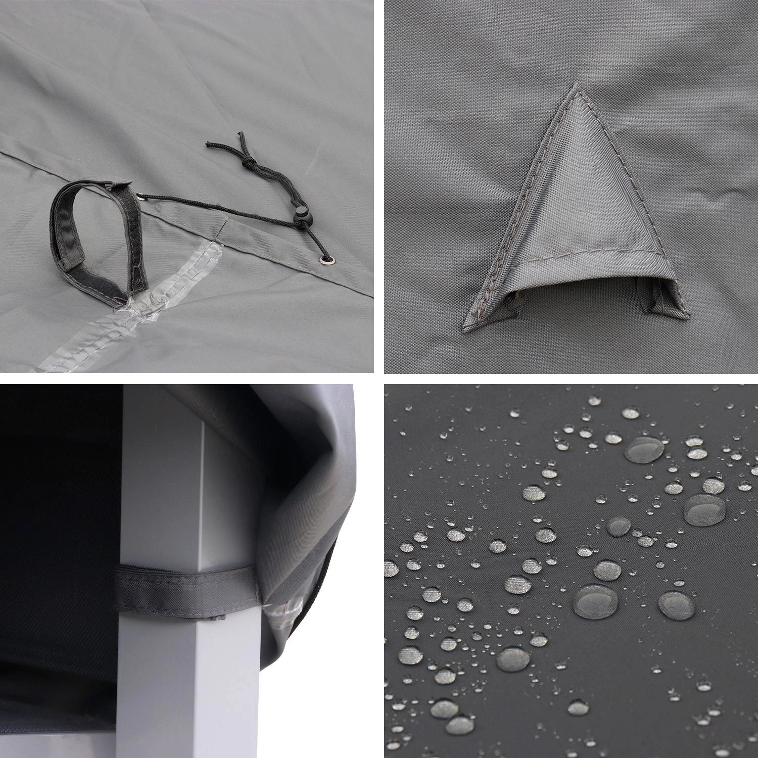 Protégez votre salon de jardin lorsque vous ne l’utilisez pas pour allonger sa durée de vie. Cette housse est en polyester avec un revêtement en polyamide. Déperlante et imperméable grâce à l’enduction PA, elle préserve votre ensemble de jardin de la pluie, de la poussière et du soleil. Cela évite l’usure et les dégradations liées aux intempéries. Pratique, cette housse traitée anti UV est dotée d’un cordon de serrage avec œillets intégrés. Ce cordon est inséré dans l’ourlet et il ressort dans les angles, cela permet de maintenir la housse sur le salon de jardin. Quatre aérateurs placés sur la housse empêchent la condensation. L’air libre circule également par le bas. Ainsi, les risques de moisissures sont évités.