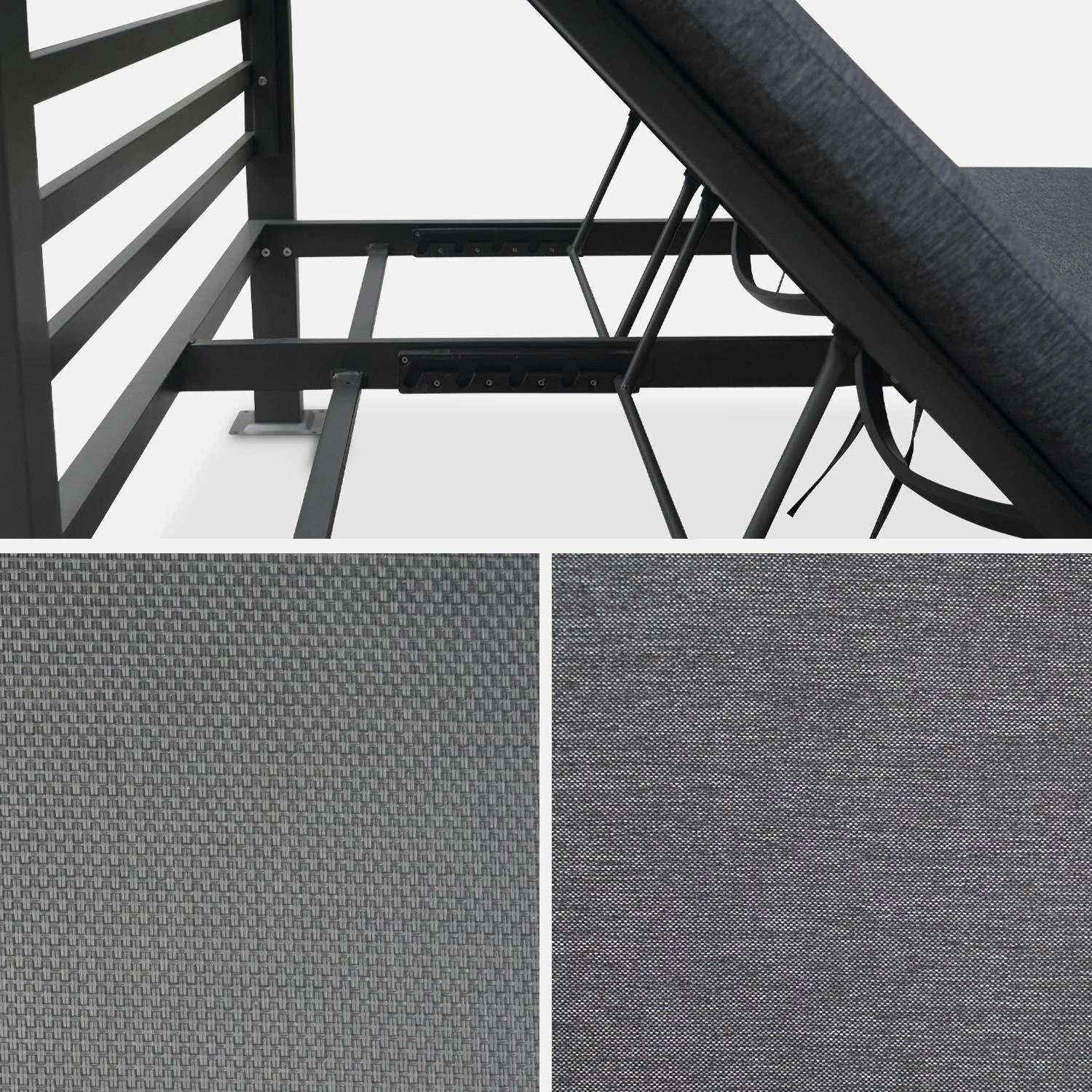 La structure de ce lit de jardin est en aluminium. Elle est parfaitement adaptée pour l’extérieur car l’aluminium ne rouille pas et ne craint pas les intempéries ou les rayons du soleil.