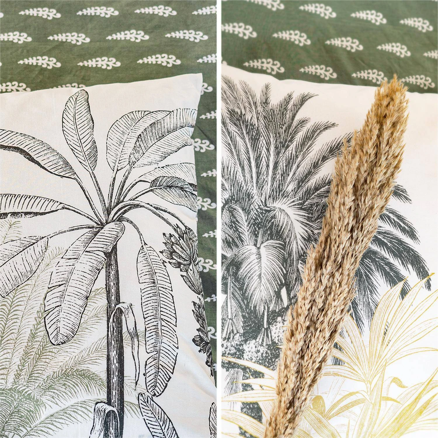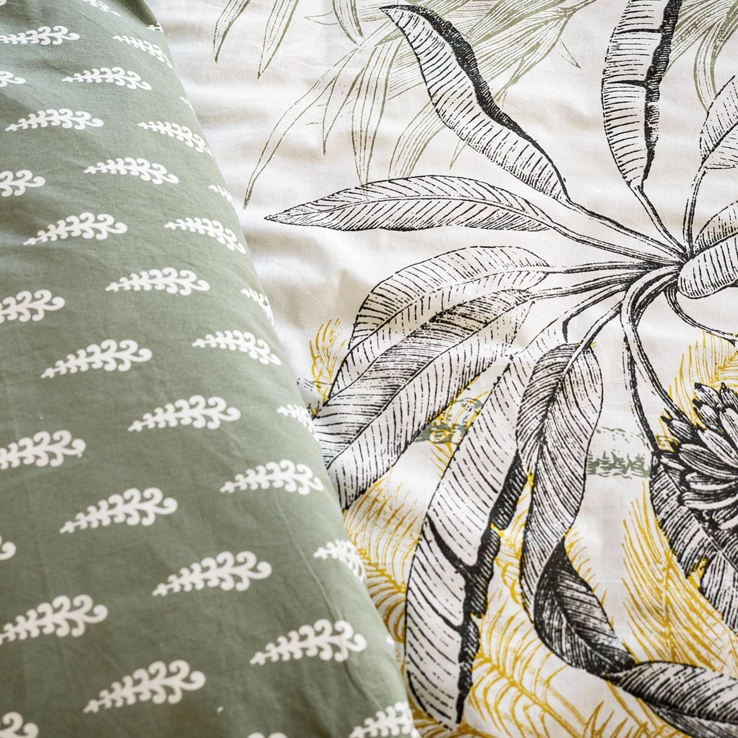Envie de voyager tout en restant bien au chaud sous la couette ? La parure PALMERA est faite pour vous ! Ses jolis motifs en forme de palmier réversible vous emmèneront tout droit dans la jungle ou sur une île paradisiaque au soleil ! À vous les nuits de sommeil à rêver d’aventure et d’expédition endiablée ! Ses couleurs claires quant à elles, lui apportent un aspect moderne et élégant qui s’adapte à toutes les décorations. La parure est en coton adouci pour une sensation de douceur qui vous fera passer d’agréables nuits. Cerise sur le gâteau, cette parure de lit a été conçue de manière durable et est certifiée Better cotton & made in green. Des boutons et des passe-mains ont été ajoutés à se linge de lit afin de vous simplifier la vie. A noter également que cette parure de lit est réversible, vous pourrez alors choisir le côté que vous préférez pour votre lit douillet ! Que demander de plus ?