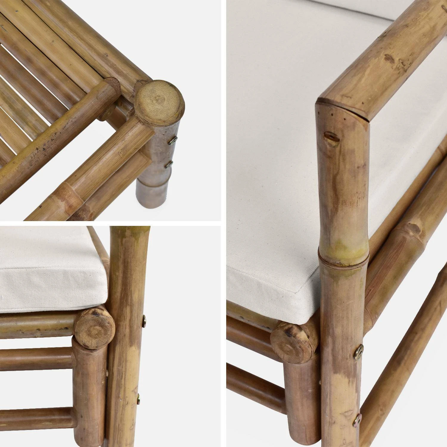 Pour profiter d’agréables moments dans votre jardin, rien de tel que notre ensemble Manille. Composé d’un canapé, de 2 fauteuils et d’une table basse, il est parfait pour une terrasse ou un balcon. Avec sa structure arrondie en bambou provenant du Vietnam et son assise couleur crème, ce salon ne manque pas de charme. Il apportera une touche exotique et ravira les adeptes de la décoration bohème.