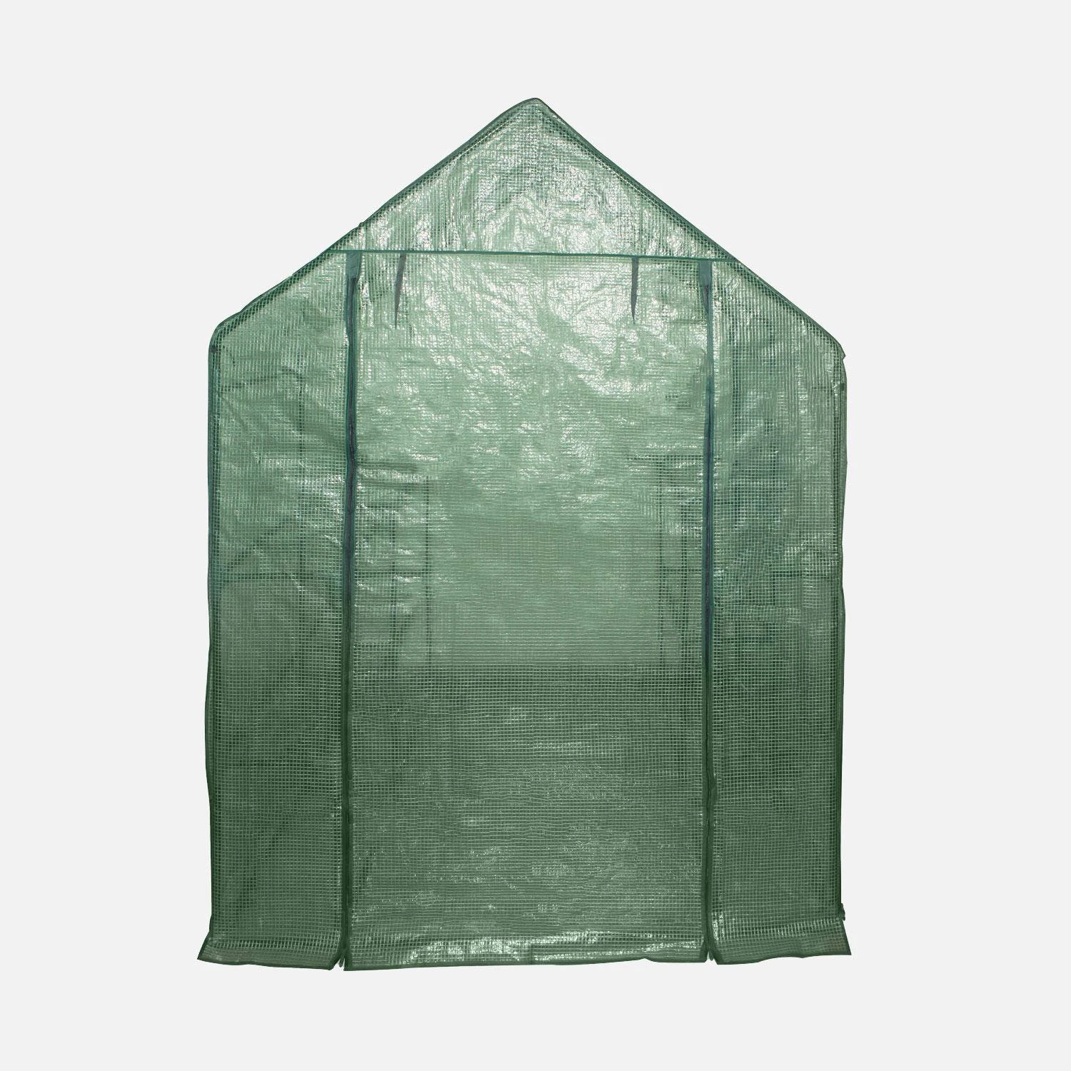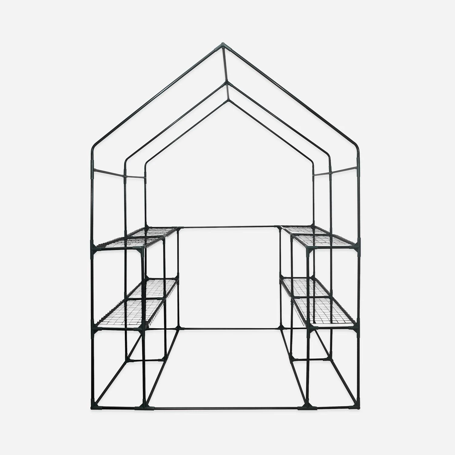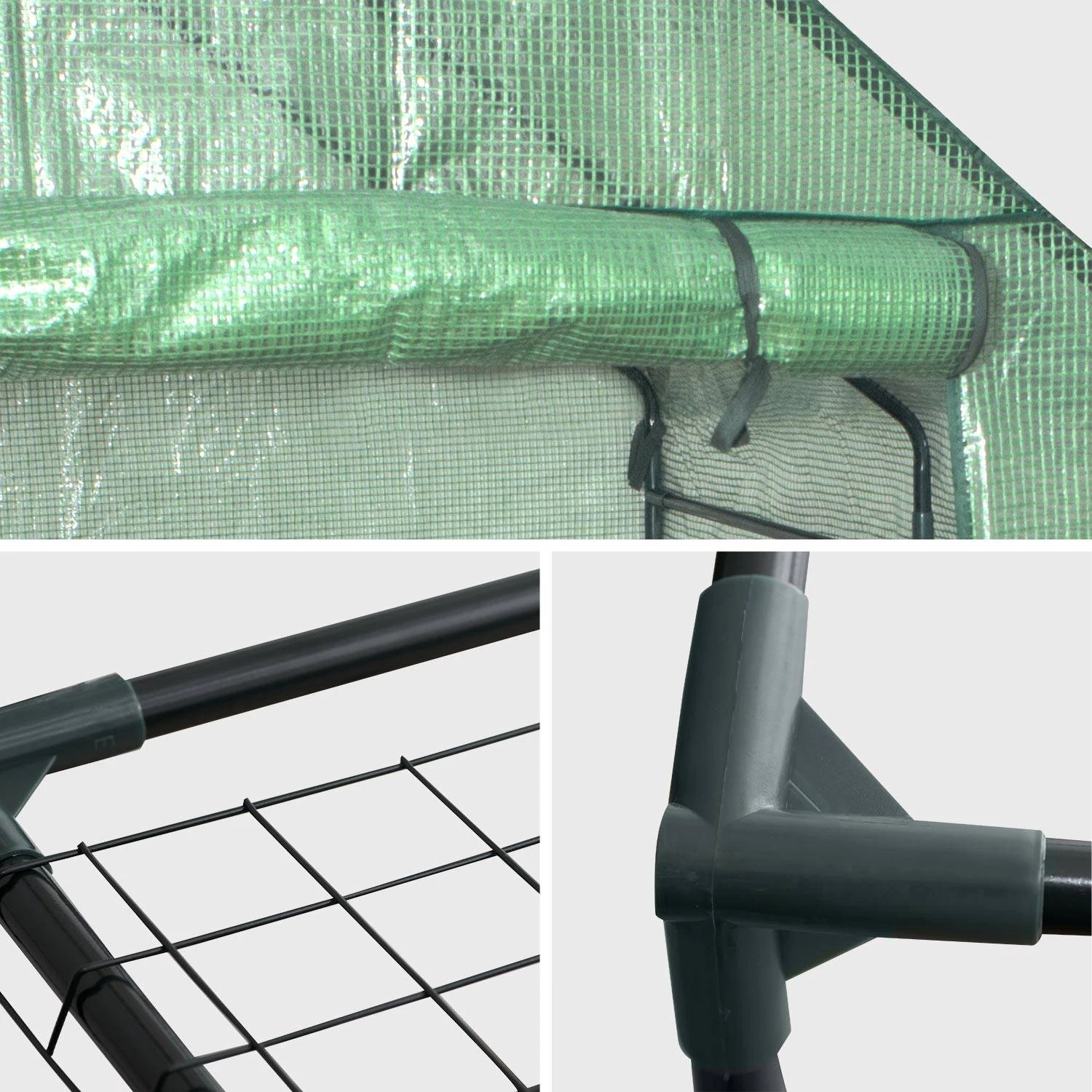 La serre de jardin est en polyéthylène vert d’une densité de 135g/m². C’est une toile souple et résistante. Les parois sont munies de débords de film à enfouir sous la terre pour fixer la serre. La structure de la serre est en acier recouvert de peinture époxy qui retarde l’apparition de trace de corrosion. Le montage de la serre est facile.