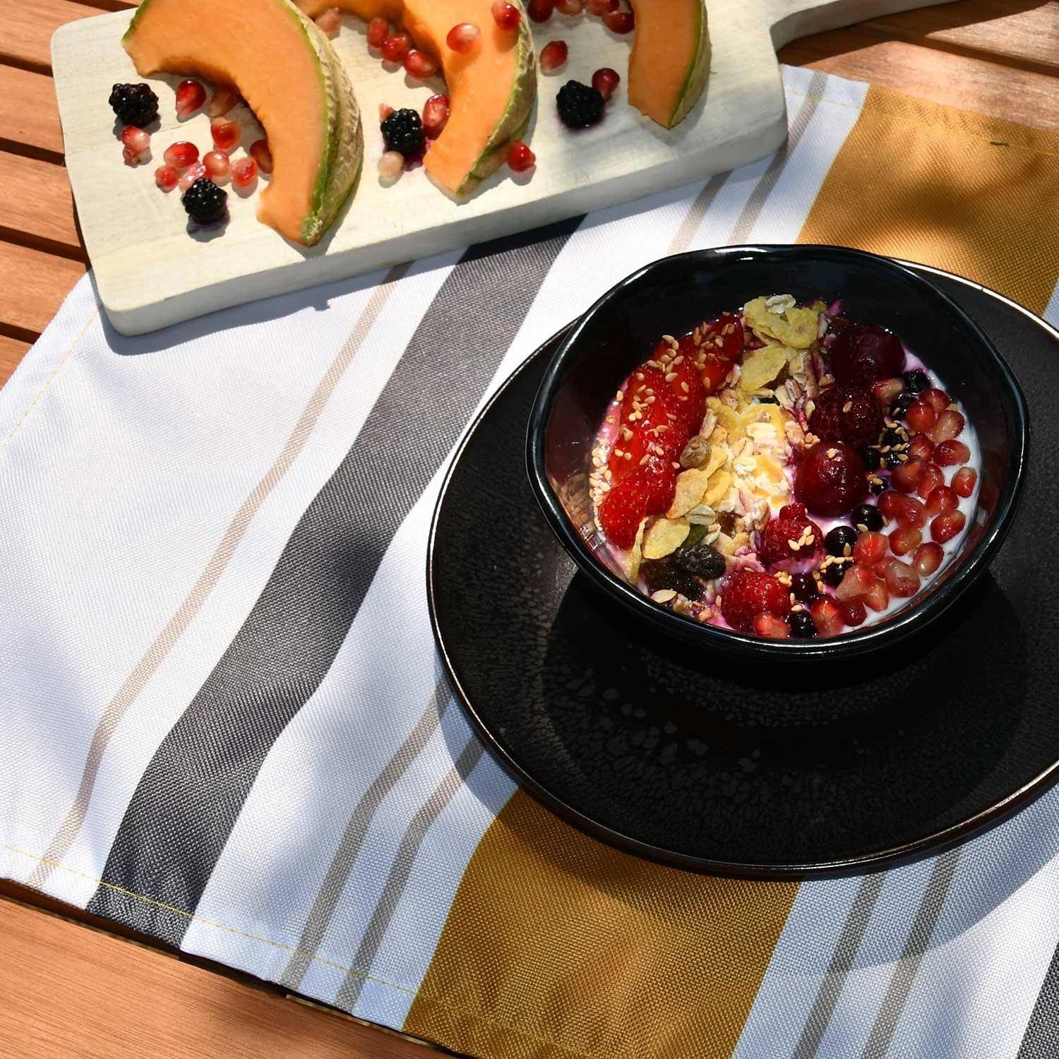 Offrez à votre table un style estival avec ces sets de table 100% polyester. Ils habillent votre table avec élégance et la protègent des griffes et éclaboussures. Ils sont déperlants et réversibles avec un côté à motifs bandes et un côté gris uni. Changez de côté selon vos envies !