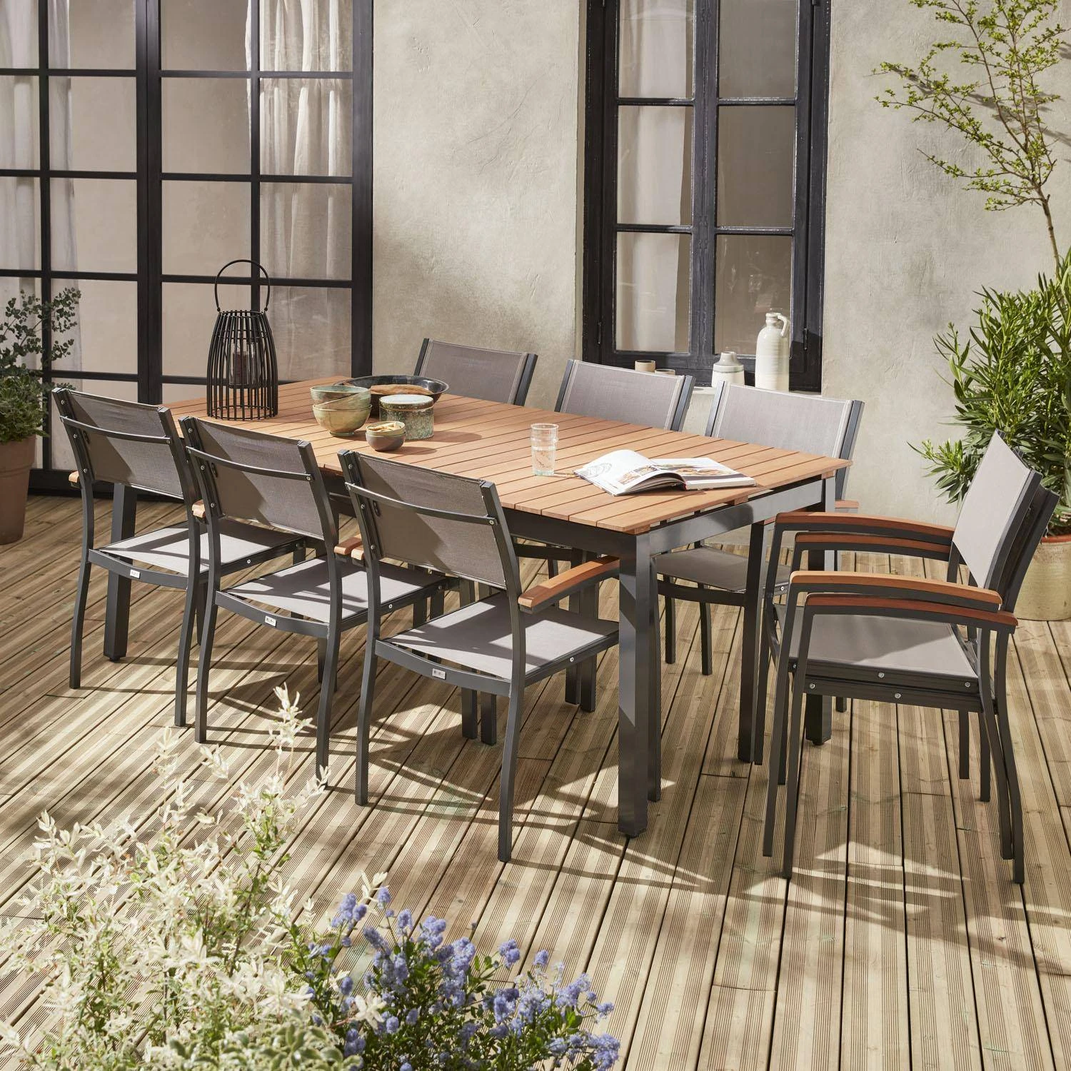 Avec un mix de bois, de textilène et d’aluminium, l’ensemble de jardin Sevilla est rĂ©solument contemporain. Chic et Ă©purĂ©, il trouve sa place facilement dans tous les environnements. Pratique, la table est extensible. Elle passe de 2m Ă 2,5m pour recevoir plus de convives. Pour ce faire, il suffit de tirer les extrĂ©mitĂ©s de la table et de dĂ©plier la rallonge papillon intĂ©grĂ©e. Lorsqu’elle est Ă©tendue, la table peut accueillir en son centre un parasol dont le diamètre de dĂ©passe pas 50 mm. Il est impĂ©ratif d’utiliser une base (non fournie) pour maintenir le parasol. Les fauteuils s’empilent et se rangent facilement.